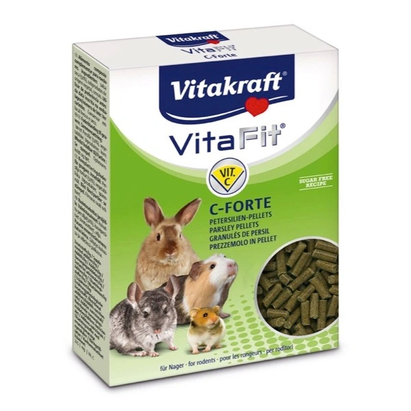 I pellet di prezzemolo particolarmente gustosi e fonte supplementare di vitamina C rinforzano le difese immunitarie. Importante specialmente per i porcellini d’India, dato che questi animali non sono in grado di sintetizzare da soli la vitamina C essenziale. Anche altri roditori possono compensare un fabbisogno supplementare di vitamina C provocato da stress, malattia o gravidanza con C-Forte.